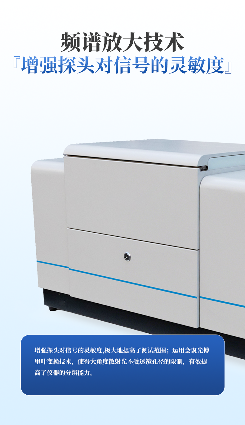 頻譜放大技術增強探頭對信號的靈敏度,極大地提高了測試范圍;運用會聚光傅里葉變換技術,使得大角度散射光不受透鏡孔徑的限制,有效提高了儀器的分辨能力。