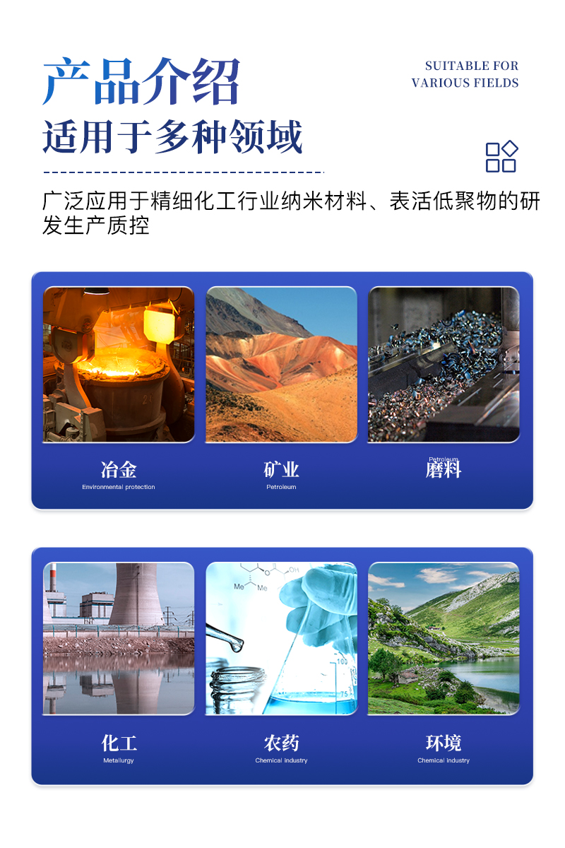 激光粒度分析儀同時具有Zeta電位及納米粒徑的分析測試功能,適用于多種不同的納米乳液、懸浮液膠體等的粒度和表面電位測量,能廣泛應用于精細化工行業納米材料、表活、低聚物等的研發和生產質控,同時也是油墨,醫藥制劑等行業產品研發及質控檢測儀器。